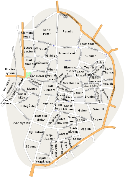 *) Lunds medeltida stadskärna är indelad i fyra rotar.
